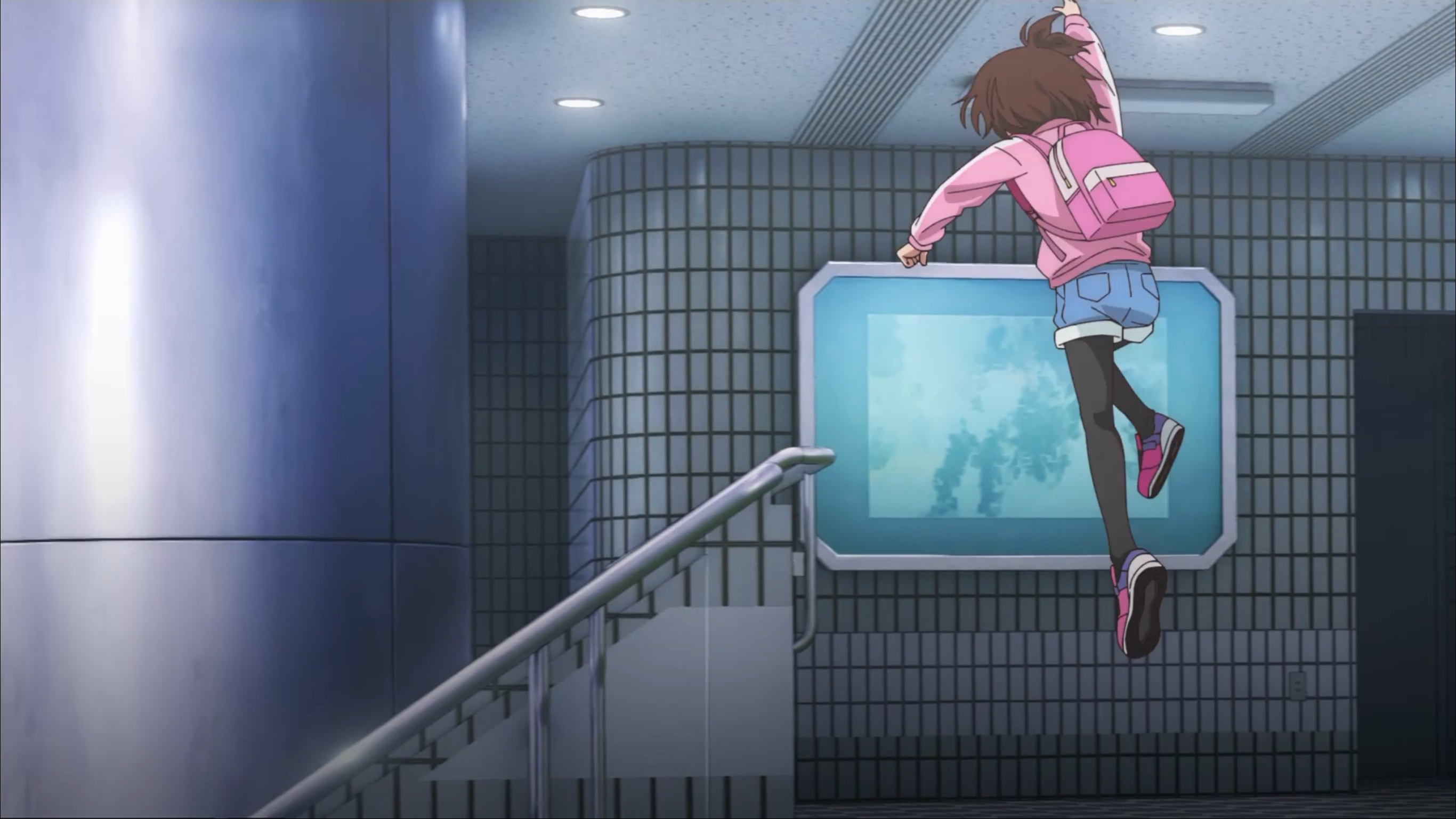 第1話の“見せ場”の一つが手すりスライドのシーン(上図)だろう。深くしゃがみ込んでからの高い跳躍,安定した滑降,着地時の衝撃吸収という一連の流れが,リアルな身体動作と共に描き出されている。ここでもやはり手の表情が面白い。